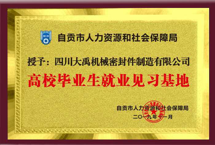 2019年11月,四川大禹機械密封件制造有限公司榮獲“自貢市高校畢業生就業見習基地”稱号。